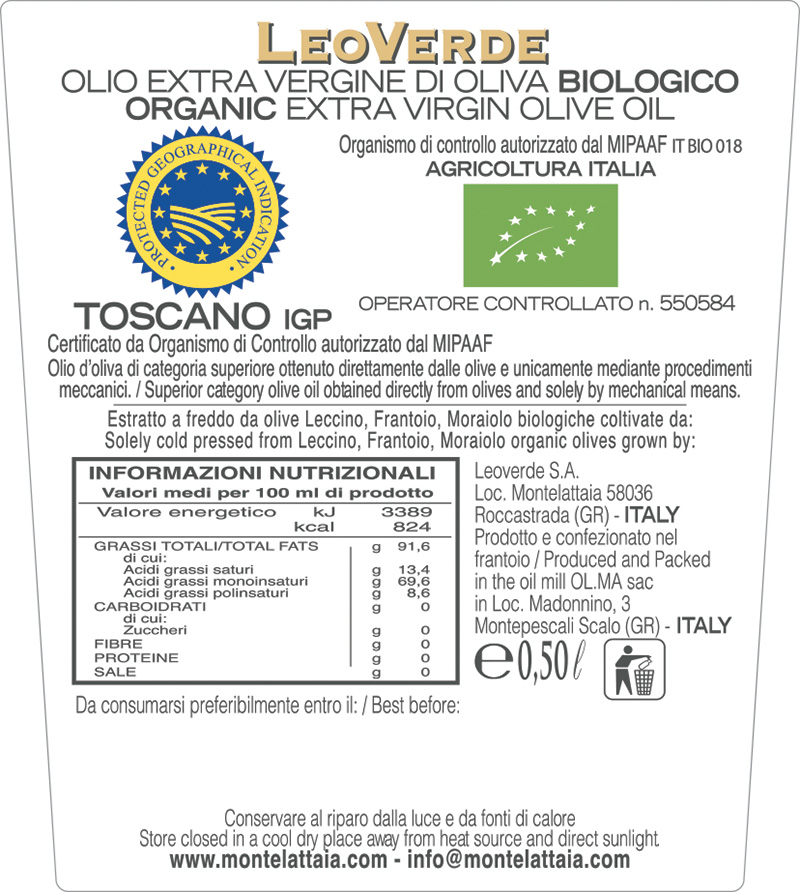 LeoVerde Olio Extra Vergine di Oliva Biologico a marchio Toscano IGP (indicazione geografica protetta), prodotto nella Tenuta di Montelattaia dai nostri 2400 olivi coltivati in agricoltura biologica. Franto a freddo entro 6 ore dalla raccolta da varietà Leccino. Conservato in fusti di acciaio, sotto azoto ed a temperatura controllata. Acidità 0,15, Polifenoli oltre 500mg (vedi scheda tecnica)